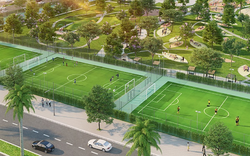 - Điểm nhấn tiện ích làm nên thương hiệu dự án là Tổ hợp Công viên Thể thao quy mô hàng đầu Đông Nam Á với chuỗi 8 công viên theo chủ đề, 200 sân thể thao các loại, 1000 máy tập gym, hồ điều hòa và kênh đào thành phố,..